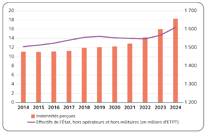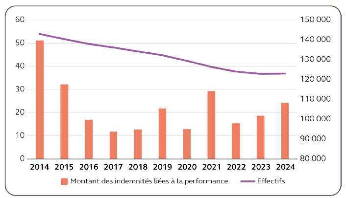 * 2 En partie retraité par la Cour des comptes, avec le retranchement des « primes de rendement » servies au ministère de l'économie et des finances (436 millions d'euros en 2024), considérées à tort par la DGAFP comme étant une prime à la performance, alors que le montant de ces indemnités est, en pratique, fixe et ne se fonde sur aucun critère d'appréciation de l'engagement ou des résultats.