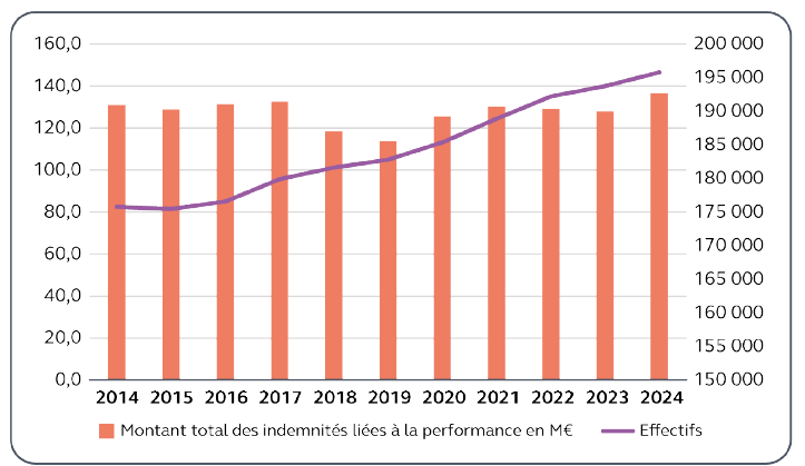 * 13 En partie retraité par la Cour des comptes, avec le retranchement des « primes de rendement » servies au ministère de l'économie et des finances (436 millions d'euros en 2024), considérées à tort par la DGAFP comme étant une prime à la performance, alors que le montant de ces indemnités est, en pratique, fixe et ne se fonde sur aucun critère d'appréciation de l'engagement ou des résultats.