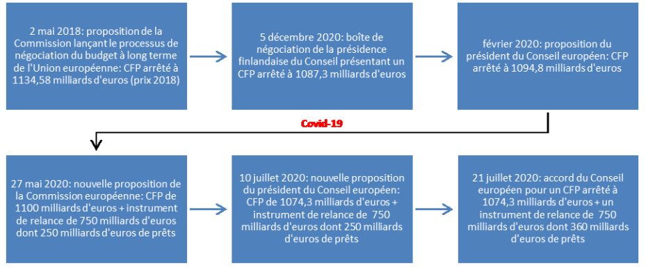 * 16 Pour le CFP 2014-2020 la proposition de la Commission avait été présentée le 29 juin 2011 et l'accord final est intervenu le 8 février 2013. Pour le CFP 2021-2027, la présentation de la proposition a été faite le 2 mai 2018 et l'accord final a été obtenu le 21 juillet 2020.