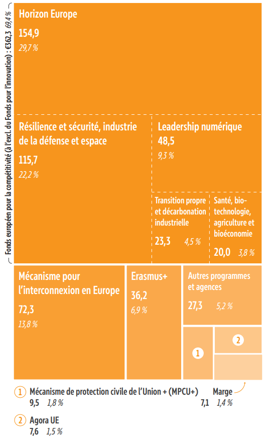 * 45 Horizon Europe, le Fonds d'Innovation, Digital Europe, MIE, FEDef, ASAP, EDIRPA, EDIP, EU4Health, Programme Espace, Iris2, InvestEU, Programme Marché unique, LIFE.