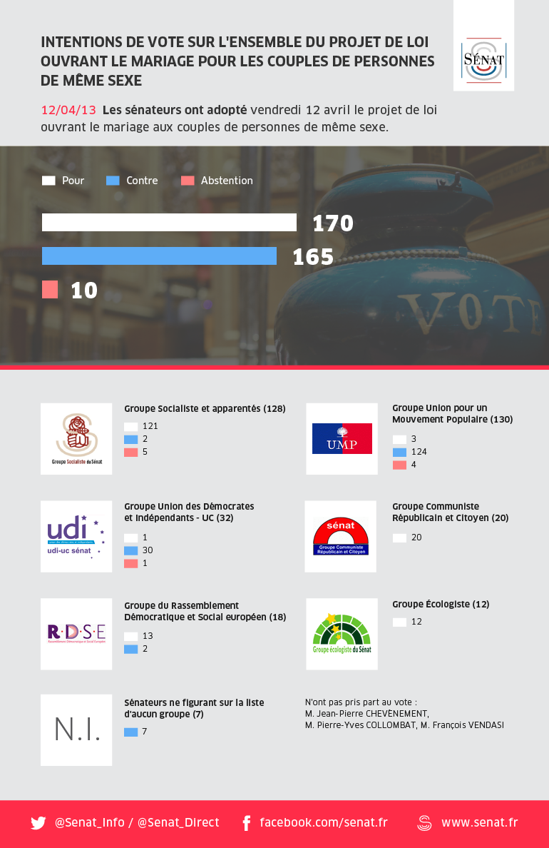 Le projet de loi ouvrant le mariage aux couples de personnes de même sexe a été examiné en séance publique du jeudi 4 avril 2013, à 16 heures, au vendredi 12 avril, à 11h45. Le projet de loi a été adopté par le Sénat.