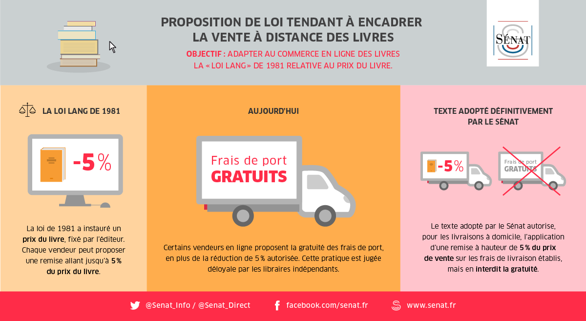 Cette proposition de loi vise à lutter contre certaines pratiques de vendeurs en ligne, qui proposent, en plus de la réduction de 5 % autorisée, la gratuité des frais de port. Cette pratique est jugée déloyale par les libraires traditionnels.