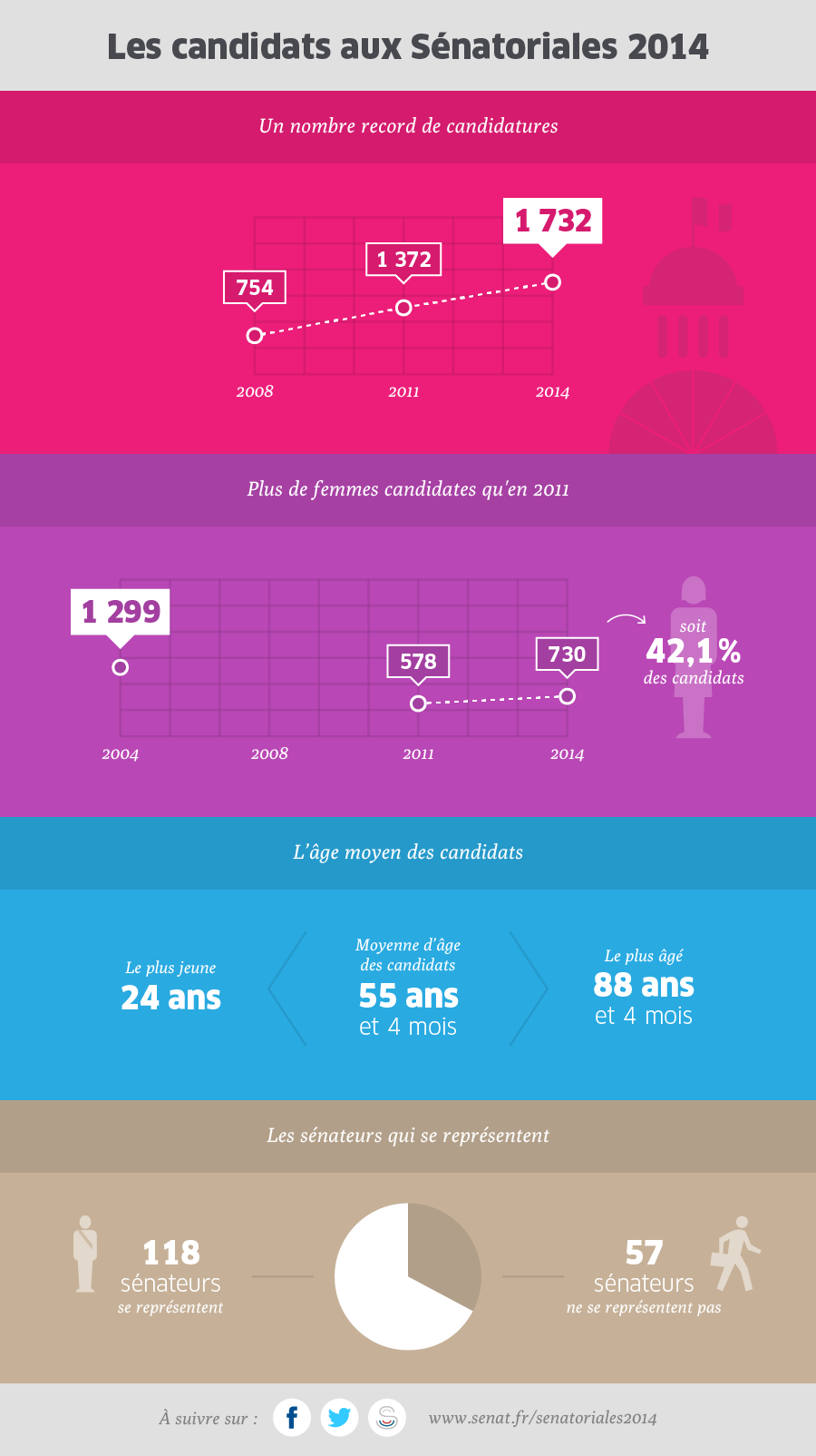 Lundi 15 septembre 2014, le Ministère de l’Intérieur a dévoilé les 1 732 candidats aux élections sénatoriales, qui auront lieu le 28 septembre 2014. Elles permettront de renouveler 178 sièges de la série 2. Ce nombre de candidatures constitue un record pour cette élection : on comptait 1 374 candidats en 2011 et 754 en 2008.