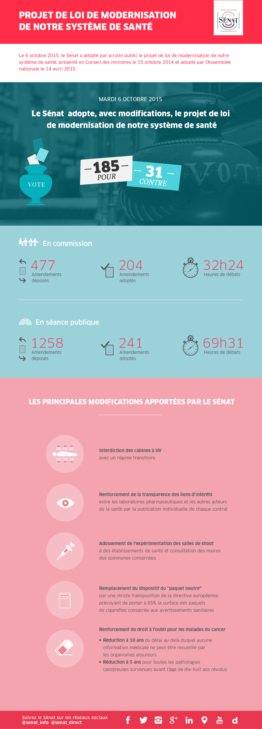 Mardi 6 octobre 2015, à l’issue des explications de vote des groupes, un vote solennel a été organisé en salle des Conférences. Le Sénat a adopté le projet de loi de modernisation de notre système de santé par 185 voix pour et 31 contre.
