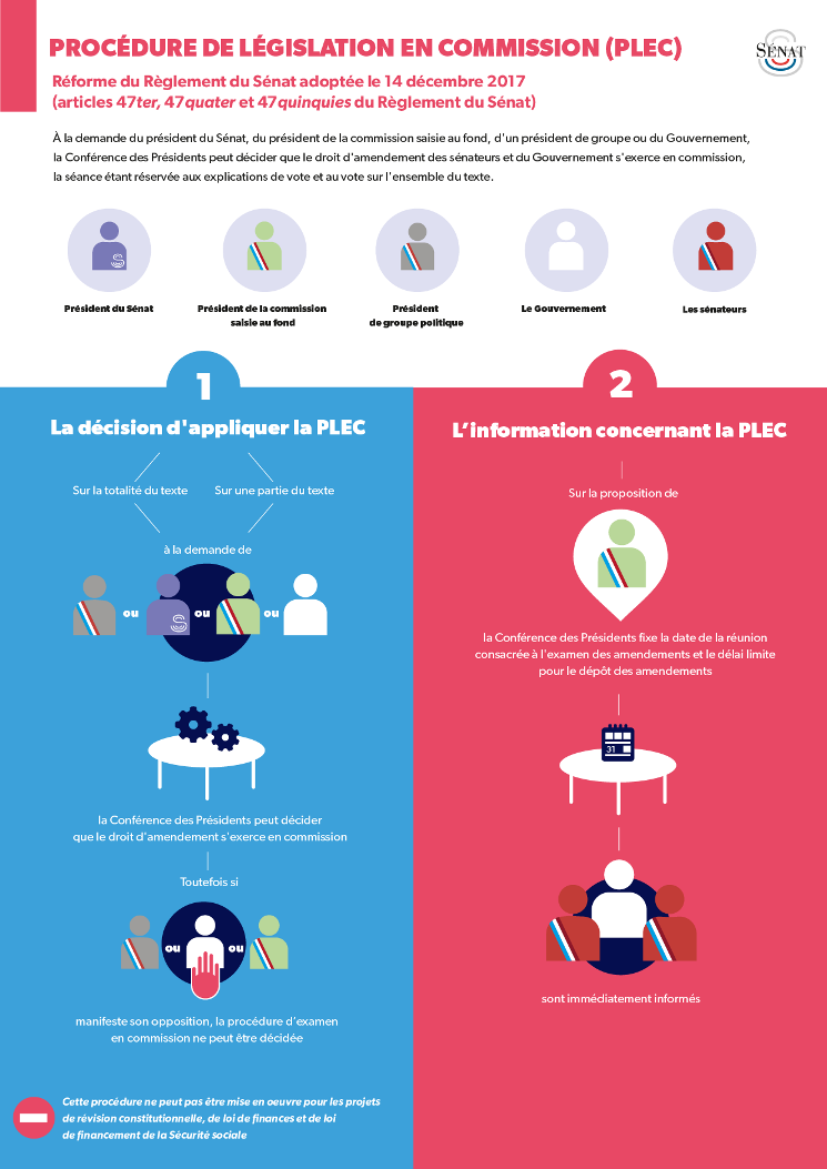 En application de la réforme du Règlement du Sénat adoptée le 14 décembre 2017, la Conférence des Présidents peut mettre en œuvre la procédure de législation en commission sur tout ou partie d'un projet de loi ou d'une proposition de loi ou de résolution. Le droit d'amendement des sénateurs et du Gouvernement sur les articles concernés s'exerce alors uniquement en commission, tandis que la séance plénière est centrée sur les explications de vote et le vote.