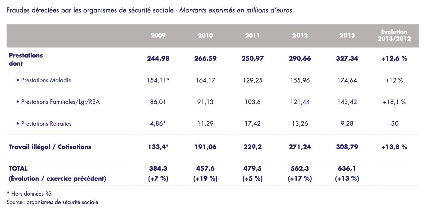 En 2008 était créée la Délégation nationale de lutte contre la fraude (DNLF), outil exclusivement consacré à la lutte contre tout type de fraude. Sous la responsabilité du ministre du Budget et des comptes publics, cette délégation a pour mission de piloter la coordination des administrations et des organismes publics en charge de la lutte contre la fraude sociale. Son bilan pour l'année 2013 montre que la fraude sociale représente 636,1 millions d'euros. Ce montant se décompose entre la fraude aux prestations et la fraude aux cotisations/lutte contre le travail illégal.