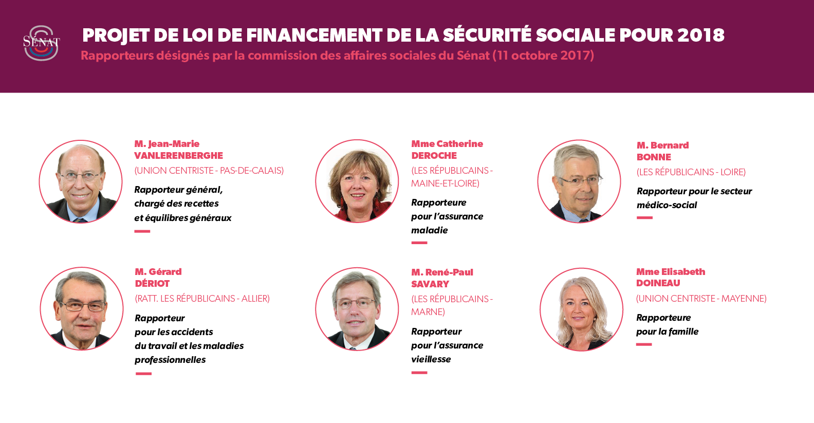 Mercredi 8 novembre 2017, la commission des affaires sociales a adopté le rapport sur le projet de loi de financement de la sécurité sociale pour 2018 (Jean-Marie VANLERENBERGHE, rapporteur général en charge des équilibres financiers généraux, Catherine DEROCHE, rapporteure pour l’assurance maladie, Bernard BONNE, rapporteur pour le secteur médico-social, Gérard DÉRIOT, rapporteur pour les accidents du travail et les maladies professionnelles, René-Paul SAVARY, rapporteur pour l’assurance vieillesse et Élisabeth DOINEAU, rapporteure pour la famille).
