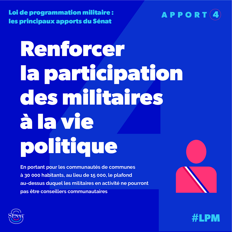 - de permettre aux militaires en position d’activité d’exercer un mandat de conseiller communautaire dans les communautés de communes regroupant moins de 30 000 - et pas seulement 15 000 - habitants (amt COM-85) ;