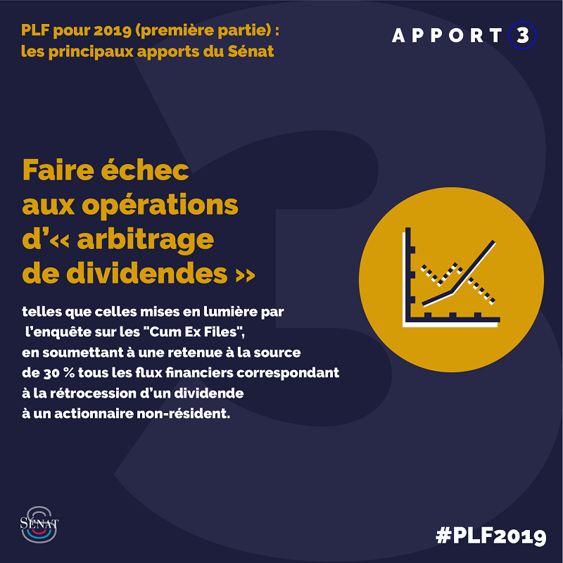- Communiqué du 22 novembre 2018 de la commission des finances - "Cum Ex Files" : le Sénat va proposer un dispositif pour faire échec à l’arbitrage de dividendes dès le projet de loi de finances pour 2019