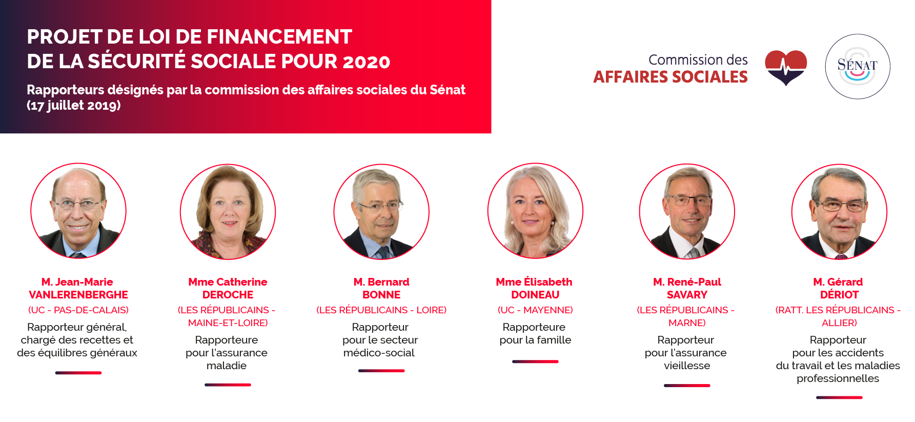 Mercredi 6 novembre 2019, la commission des affaires sociales a adopté le rapport sur le projet de loi de financement de la sécurité sociales pour 2020 (Jean-Marie VALENRENBERGHE, rapporteur général, chargé des équilibres financiers généraux, Catherine DEROCHE, rapporteure pour l'assurance maladie, Bernard BONNE, rapporteur pour le secteur médico-social, Gérard DÉRIOT, rapporteur pour les accidents du travail et les maladies professionnelles, René-Paul SAVARY, rapporteur pour l'assurance vieillesse, et Élisabeth DOINEAU, rapporteure pour la famille).