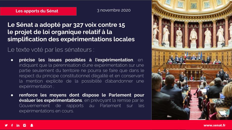 Mardi 3 novembre 2020, le Sénat a examiné le projet de loi organique relatif à la simplification des expérimentations mises en œuvre sur le fondement du quatrième alinéa de l'article 72 de la Constitution.