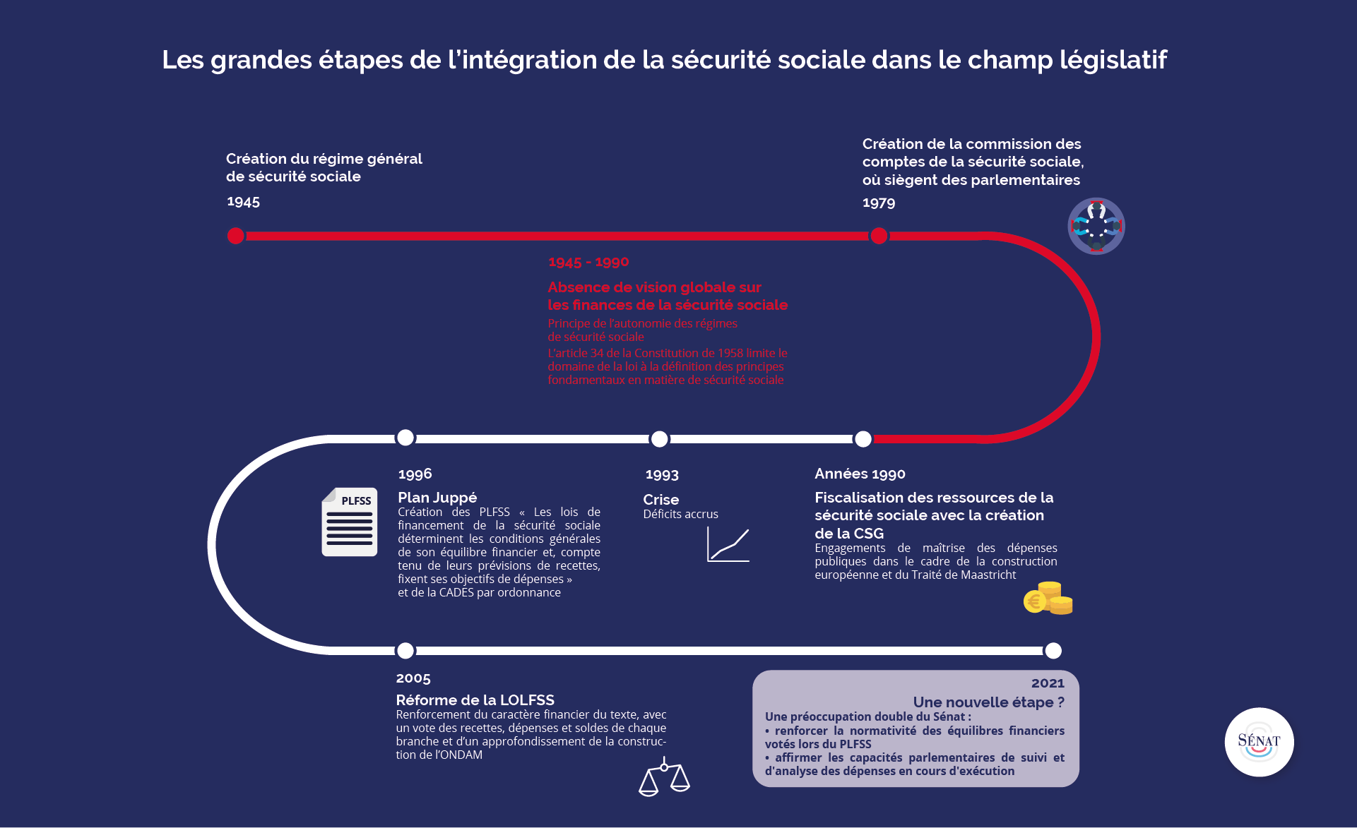 Au Sénat, Jean-Marie VANLERENBERGHE, alors rapporteur général de la commission des affaires sociales, Catherine DEROCHE, présidente de la commission, Alain MILON, son prédécesseur, ainsi que l'ensemble des rapporteurs du PLFSS ont déposé, le 26 mars 2021, une proposition de loi organique tendant à renforcer le pilotage financier de la sécurité sociale et à garantir la soutenabilité des comptes sociaux.