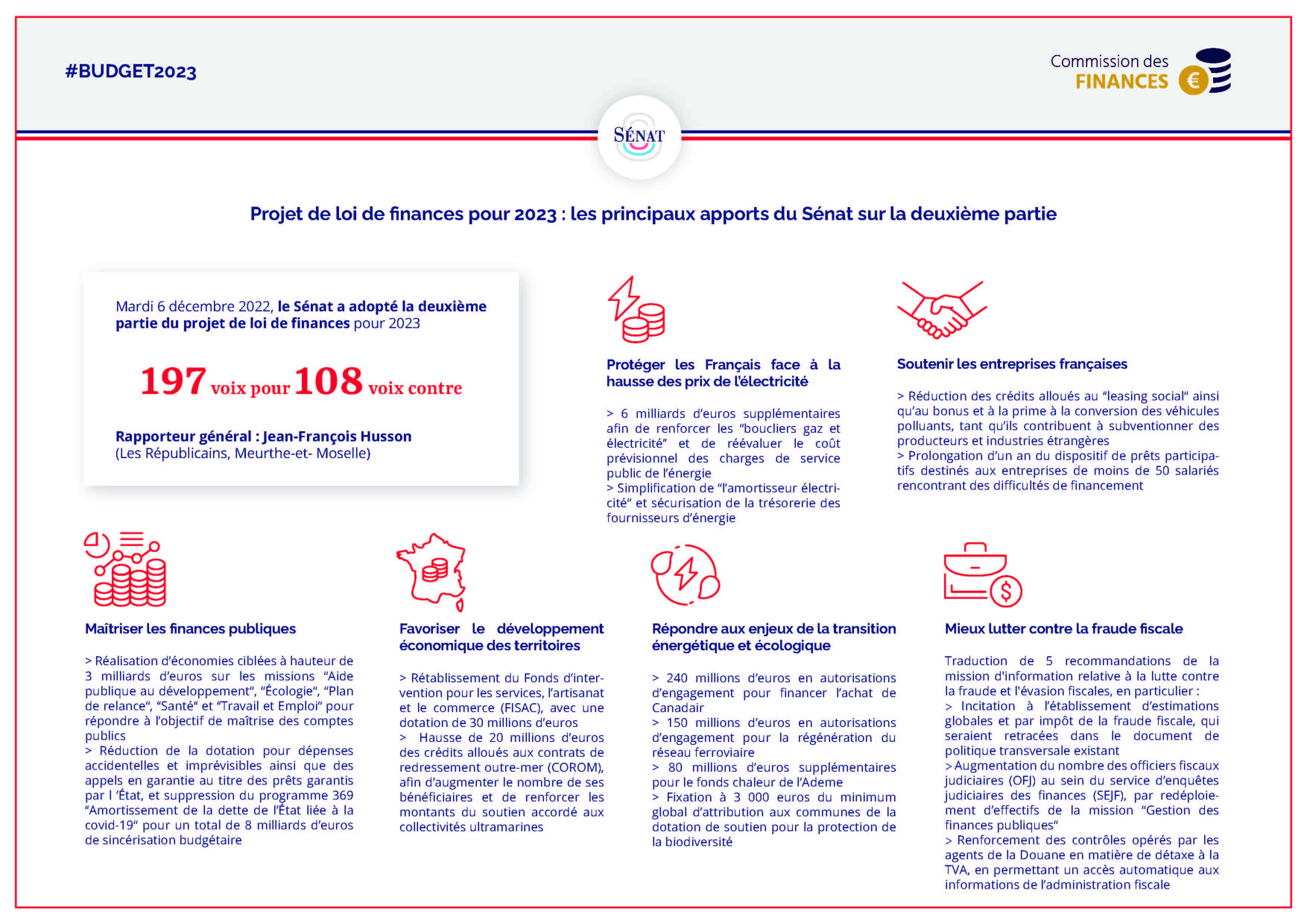 Mardi 6 décembre 2022, le Sénat a adopté avec modifications, en première lecture, le projet de loi de finances pour 2023 par 197 voix pour et 108 voix contre (voir les résultats du scrutin public).
