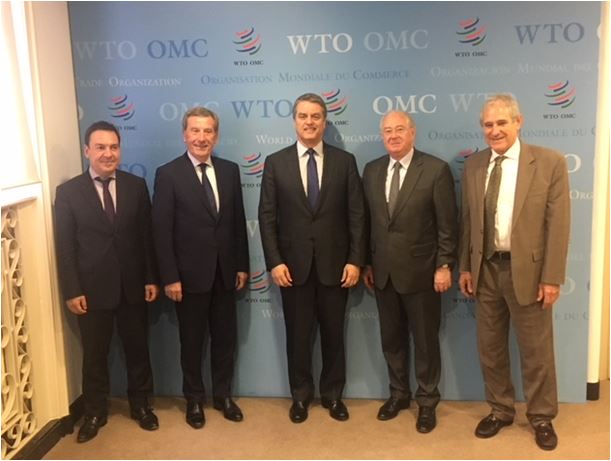 De gauche à droite : M. Jean-Marie Paugam, Délégué permanent de la France auprès de l’OMC, M. Jean-Paul Emorine, co-président du groupe de suivi du Sénat sur les négociations commerciales, M. Roberto Azevêdo, Directeur général de l’OMC, M. Jean Bizet, co-président du groupe de suivi du Sénat sur les négociations commerciales et M. François Rivasseau, Ambassadeur, Représentant permanent de la France auprès de l’Office des Nations unies à Genève et des organisations internationales en Suisse.