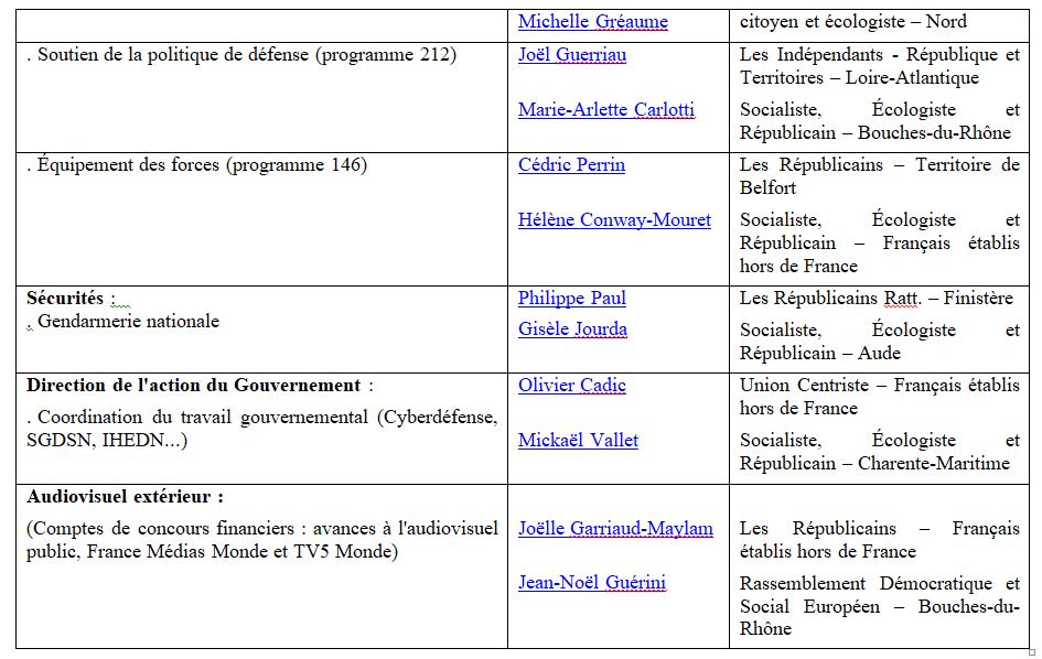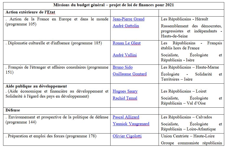 Pour chaque rapport, deux sénateurs sont désignés, l’un de la majorité sénatoriale, l’autre de l’opposition. Les rapporteurs budgétaires pour avis publieront leur rapport entre le 12 novembre et le 2 décembre.