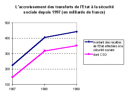 En l’an 2000, le montant des recettes de l’Etat affectées à la sécurité sociale progressera de plus de 10% en raison du transfert de nouveaux impôts, tels les droits de consommation sur les tabacs et la taxe générale sur les activités polluantes (TGAP) et cela pour 45,2 milliards de francs.