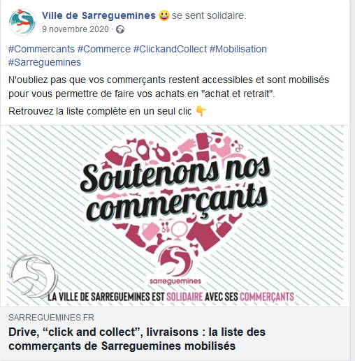 La Ville de Sarreguemines a répertorié tous les commerçants proposant le « click and collect » et a publié cette liste sur le site internet de la ville. Cette initiative est en cours de transformation vers une véritable plateforme répertoriant l’ensemble des 300 commerces, avec un moteur de recherche par activité et par type de produits vendus et un lien direct vers les sites et les réseaux sociaux des commerçants.