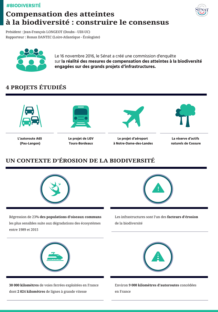 - Constitution de la commission d’enquête sur la réalité des mesures de compensation des atteintes à la biodiversité engagées sur des grands projets d’infrastructures, intégrant les mesures d’anticipation, les études préalables, les conditions de réalisation (CP du 29 novembre 2016)