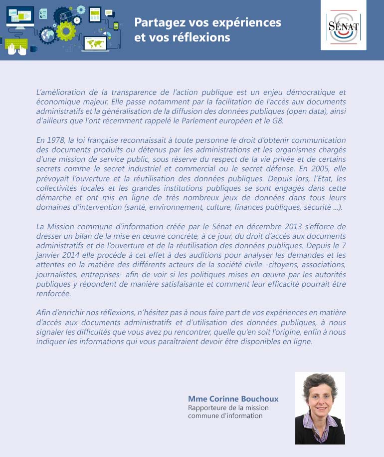 Jeudi 12 juin, la mission commune d'information a présenté à la presse les conclusions du rapport de Corinne BOUCHOUX (Ecolo - Maine-et-Loire) intitulé "Refonder le droit à l'information publique à l'heure du numérique : un enjeu citoyen, une opportunité stratégique" et adopté le 5 juin 2014.